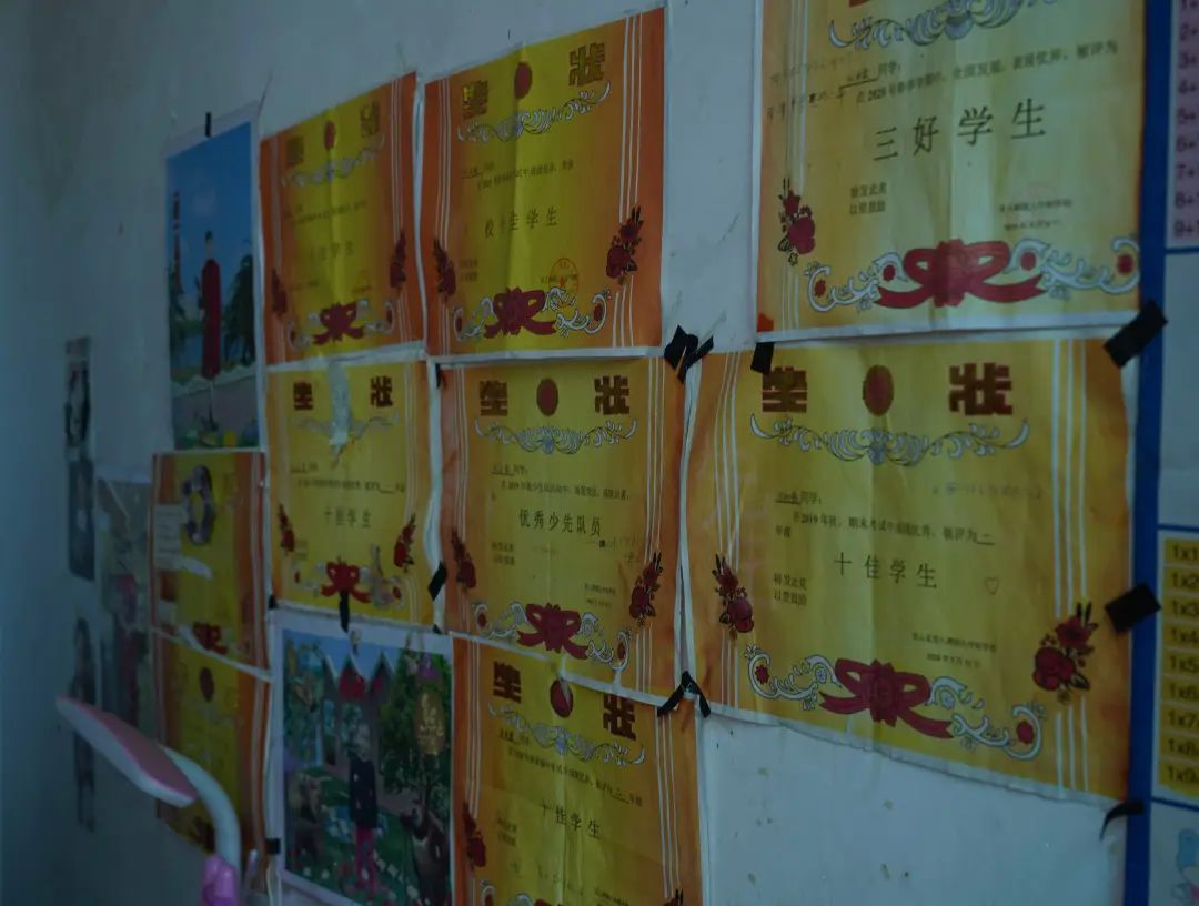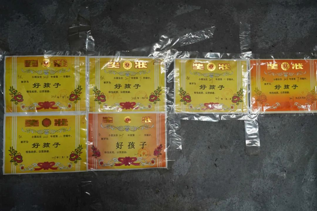 ▲被資助孩子在學校表現(xiàn)優(yōu)異,獎狀貼滿墻