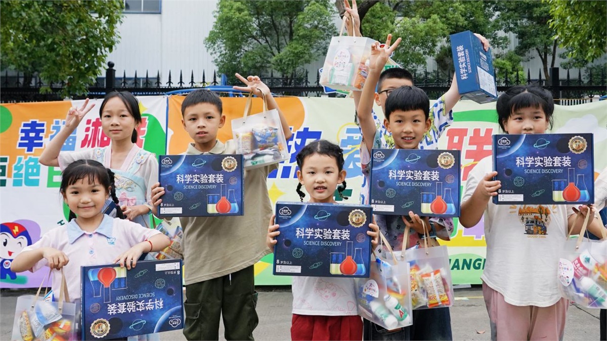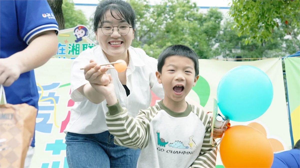 運動會后,小朋友們在“湘聯(lián)寶貝歡樂集市”領(lǐng)取了零食禮包和科普實驗套裝,孩子們捧著禮物,臉上洋溢著滿足與幸福。
