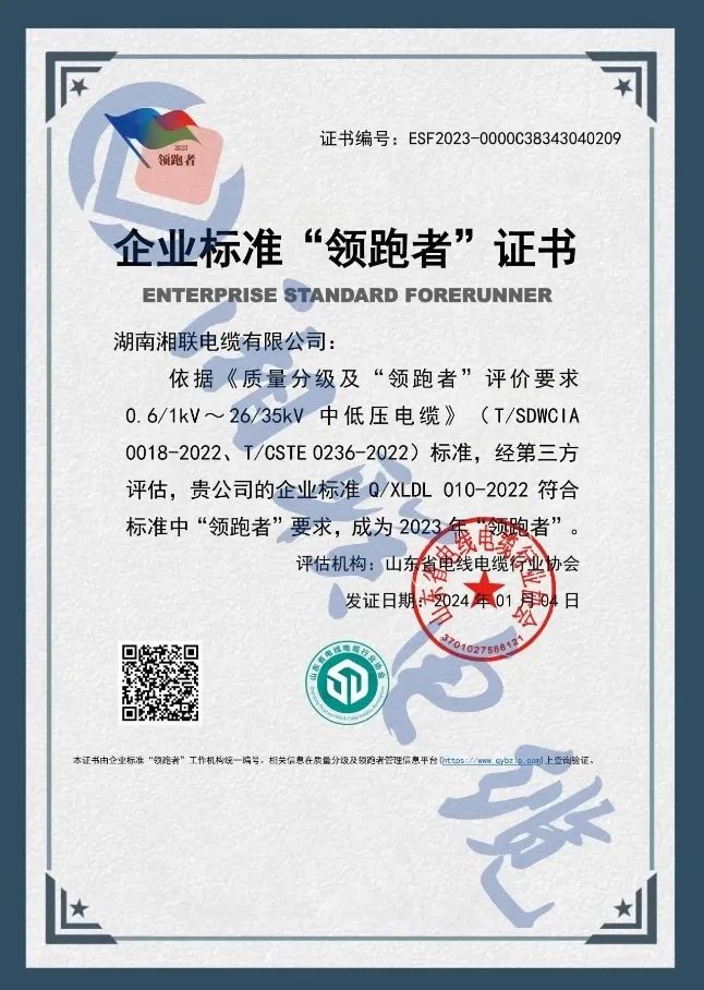 二月,企業(yè)標(biāo)準(zhǔn)領(lǐng)跑者管理信息平臺公布了2023年企業(yè)標(biāo)準(zhǔn)領(lǐng)跑者名單,湖南湘聯(lián)電纜有限公司憑借企業(yè)標(biāo)準(zhǔn)Q/XLDL 010-2022,成為2023年企業(yè)標(biāo)準(zhǔn)“領(lǐng)跑者”,湘聯(lián)電纜連續(xù)三年獲此殊榮。